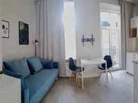 The apartment consists of a hallway, a room with a kitchenette and balcony access, and a bathroom with a toilet. Currently, the sofa is replaced by a new double bed.