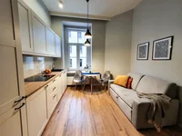 The apartment is located on the first floor of a beautiful, revitalized tenement building in a quiet part of Piotrkowska Street.