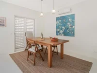 On the ground floor, the villa features an open-plan design that combines a fully furnished living room with a cosy wood-burning fireplace, a stylish dining area, and a modern kitchen equipped with high-quality appliances that have seen minimal use. A breakfast counter connects the kitchen to the living space, creating a sociable and functional environment. This level also includes a laundry room and an ensuite guest bedroom, which benefits from both interior access and a private exterior entrance, offering flexibility for visitors or extended family.
