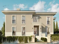 The villa is detached with a plot area of 453 m2 and a living area of 230.1 m2. It has a 5 m2 veranda and 2 parking spaces. The villa is organized into 5 bedrooms, 3 bathrooms, a dressing room, and 1 living room. The villa is in the finishing phase.