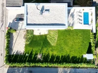 На первом этаже: просторная входная зона с гостевым туалетом, просторная кухня с просторной кухней и выходом на террасу, которая ведет дальше к бассейну и саду.