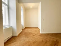 Жилая зона впечатляет благородным дубовым двухслойным паркетом в элегантном рыбоводном узоре, дополненном стильной кладкой и высокими белыми лакированными сосновыми базовыми полосами. Этот высококачественный паркетный пол толщиной 2,7 мм был лакированным и подчеркивает классический венский старый строительный рычаг особым образом. В результате получается гармоничная общая картина, которая придает квартире теплую, уютную и в то же время приподнятую атмосферу.