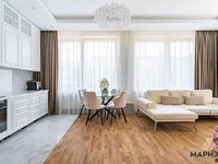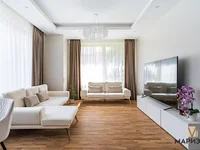 - В квартире сделан евроремонт, который находится. При отделке использовались только импортные и качественные материалы. На полу широкоформатная плитка (Италия) и уложен тёплый пол (Германия)в нескольких зонах. В жилых комнатах дубовый паркет. Высота помещения 3.31м и большие окна наполняют квартиру естественным дневным светом. Подоконники выполнены из камня. Полностью разведена вся электрика по квартире, установлены датчики напряжения. Комбинированные потолки из гипсокартона. Сан узлы облицованы Итальянской плиткой с кристаллами Swarovski. Импортная сантехника и датчики перелива воды. Разведена коллекторная система отопления – это наиболее эффективная и современная система отопления из всех существующих. Заказные двери из натурально дуба (высота 2.31м) Выведены кондиционеры. По всей квартире выполнена шумоизоляция. Имеется дорогой и качественный дизайн - проект в соответствии с которым делался ремонт.