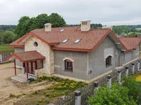 - Коттедж, выполненный в средиземноморском стиле и отделанный Бразильским кварцитом. Из красного кирпича, спроектирован и построен с сохранением климат контроля. (Стены - керамический блок, утеплитель - 100 мм; воздушная прослойка, внешняя кладка в полкирпича; общая толщина стен – 700 мм + 2см штукатурка.)
