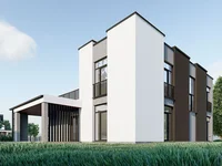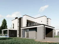 Данный проект является самым просторным из всех вариантов. Визуальная концепция двухэтажного решения с условно плоской кровлей проработана до деталей. Большие окна, обеспечивающие наполнение пространства солнечным светом, лоджия, две террасы, на одной из которых можно организовать обеденную зону с барбекю, а на второй поставить кофейный столик, шезлонг и релаксировать на свежем воздухе.