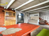 - стены из кругляка ручной работы, утеплён минеральной ватой и обшит металлическим сайдингом;