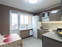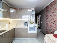 Современная просторная кухня 8,5 м2 с выходом на лоджию. Кухня оснащена качественной бытовой техникой (варочная панель, духовой шкаф, вытяжка, посудомоечная машина).