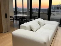 Обеденная зона: стол димаметр 120см натуральное дерево дуб и 4-х стульев из дуба. Предусмотрена система кондиционирования в каждой комнате. Собственная Терасаса 44 м.кв с лучшим панорамным видом на озеро и библиотеку.