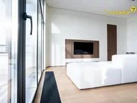 Входная дверь с внутренней панелью из шпона Американского ореха и умным замком СМАРТ. Межкомнатные двери скрытого монтажа из шпона Американского ореха высотой 300 см. Высота потолков 3.64 м. Встроенные внутрипольные конвектора Melenhoff. Новые окна черного профиля с фурнитурой ROTTO и выходом на террасу (44 кв). Стеновые панели и полка по ТВ 240 см из шпона Американского ореха.