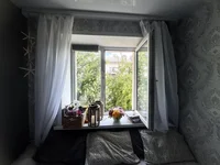 Свежий ремонт: серый ламинат, обои, окно и натяжной сатиновый потолок.