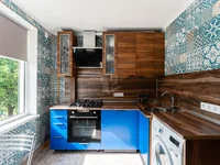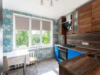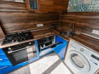 На кухне остается вся встроенная мебель. Газовая варочная панель Samsung. Кухонная вытяжка Haier. Потолок свой, окрашен. На стенах обои.