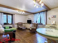Гостиная: 2 окна, шторы, деревянные балки, пол - дерево, стены и потолок = белая крашеная вагонка + декоративные карнизы, люстры - 2шт, шторы, ТВ, диван 3-х местный Раздвижной, 2 кресла, буфет, Книжный Шкаф, комод, комплект деревянные обеденный стол + 4 стула, система для навески картин