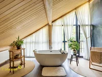 Отдельно выделяем гостевой дом в 2 этажа, на втором кинотеатр с караоке. Ванная комната, также установлен камин.