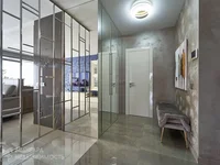 Просторная гостиная с кухней имеет панорамные 7-ми метровые окна в ширину выходящие на юго – восток и наполняют комнату дневным светом, делают ее визуально еще более просторной. Встраиваемая элитная кухня Lange фабричного производства. Оснащена всем необходимым. Любая хозяйка будет довольна местами для хранения, техническим оснащением, пространством кухни. За тепло и комфортный микроклимат отвечают стальные трубчатые радиаторы Arbonia, окна Rehau трехкамерные со светоотражением и мощный кондиционер. Из этого пространства можно попасть в кабинет, который с легкостью превращается в дополнительную комнату отдыха.