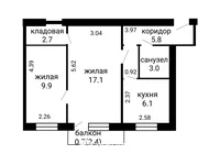 Практичная планировка: просторная кухня-гостиная с выходом на балкон, уютная спальня, кладовая для хранения вещей, совмещенный санузел и удобный коридор.