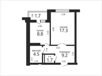 – Общая площадь – 43,2 м², жилая – 17,3 м², кухня – 8,8 м².