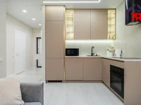 -Кухня - полностью встроенная, с фасадами в матовых оттенках и лаконичной фурнитурой. Вся техника встроена, включая духовой шкаф, варочную панель, вытяжку и микроволновку. Подсветка рабочей зоны делает кухню удобной для готовки даже в вечернее время.