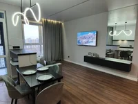 В отделке использовались современные, премиальные материалы. Металлическая входная дверь, современная мебель в приятных тонах, вся техника встроенная (посудомоечная машина, микроволновая печь, холодильник), есть телевизор, стиральная машина, кондиционер.