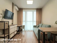 Квартира с рациональной планировкой и интерьером: отдельная спальня с выходом на остекленную лоджию и кухня-гостиная с двумя дополнительными спальными местами. Панорамное остекление и высокие потолки наполняют пространство светом.