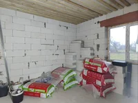 Одноэтажный дом из силикатных блоков,с возможностью сделать помещение на мансарде, крыша- вальмовая, материал -металочерепица, фундамент - плита,залит монолитный подвал. Отведено место под террасу.Огорожен со всех сторон.Имеется 2 въезда с воротами и калиткой.Обустроено парковочное место для автомобилей.