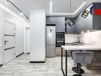 -Интерьер выполнен в едином современном стиле, без визуального шума и спорных решений. Кухня компактная, но функциональная: встроенная техника, подсветка рабочей зоны, фартук под камень, барная стойка вместо громоздкого стола - это экономит место и делает кухню удобной в повседневной жизни.