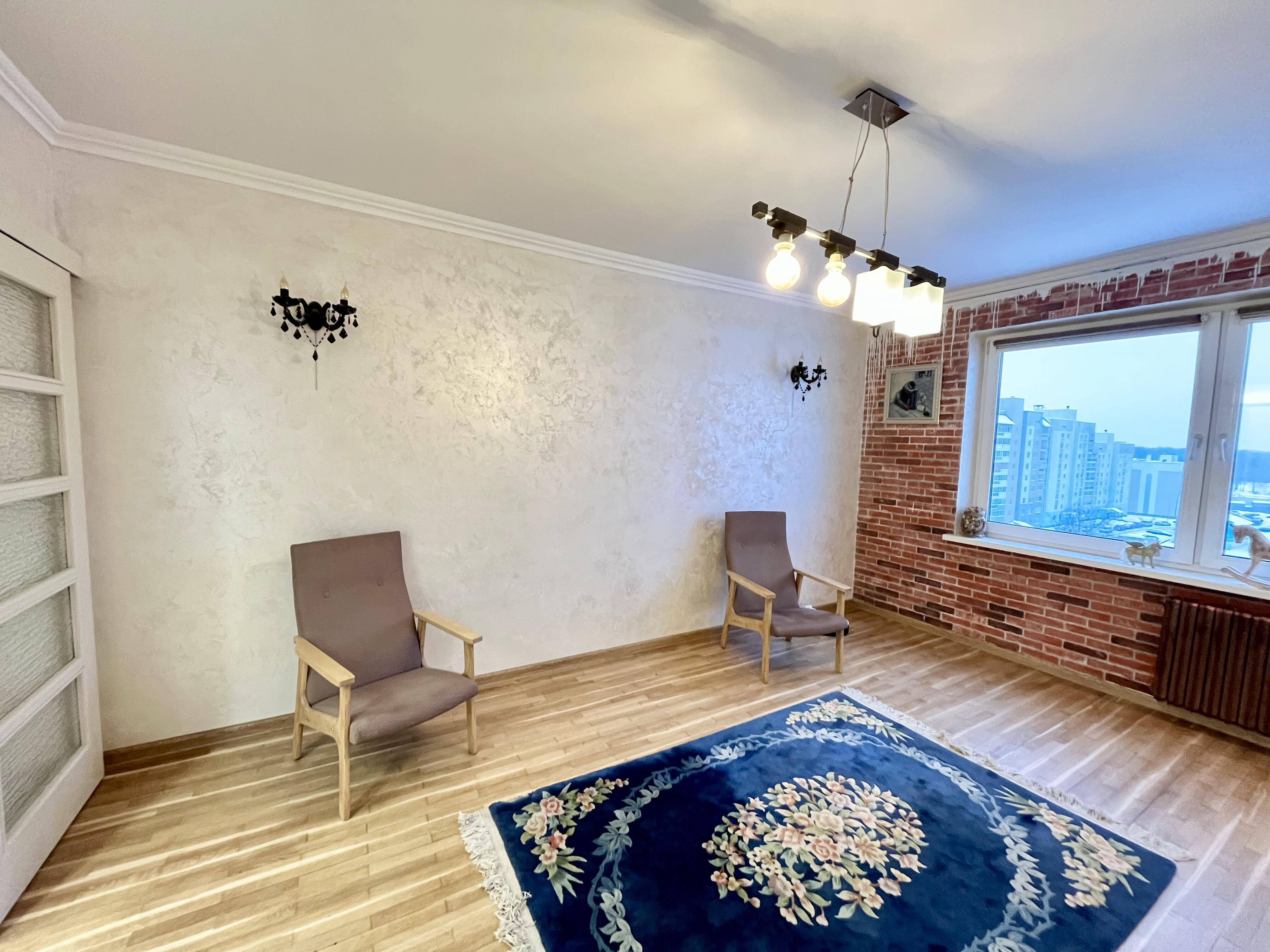 В квартире выполнен дизайнерский ремонт с премиум-материалами: окна ПВХ, окно в пол на лоджии, мет. дверь в тон межкомнатных изнутри, на полу стяжка + дубовый паркет с финским лаком, плитка,качественная импортная сантехника, стены и потолки выровнены, со встроенными светильниками, подогрев пола в ванной. Остается кухонный гарнитур с вытяжкой, встроенный большой шкаф-купе, водонагреватель. Аккуратный подъезд.