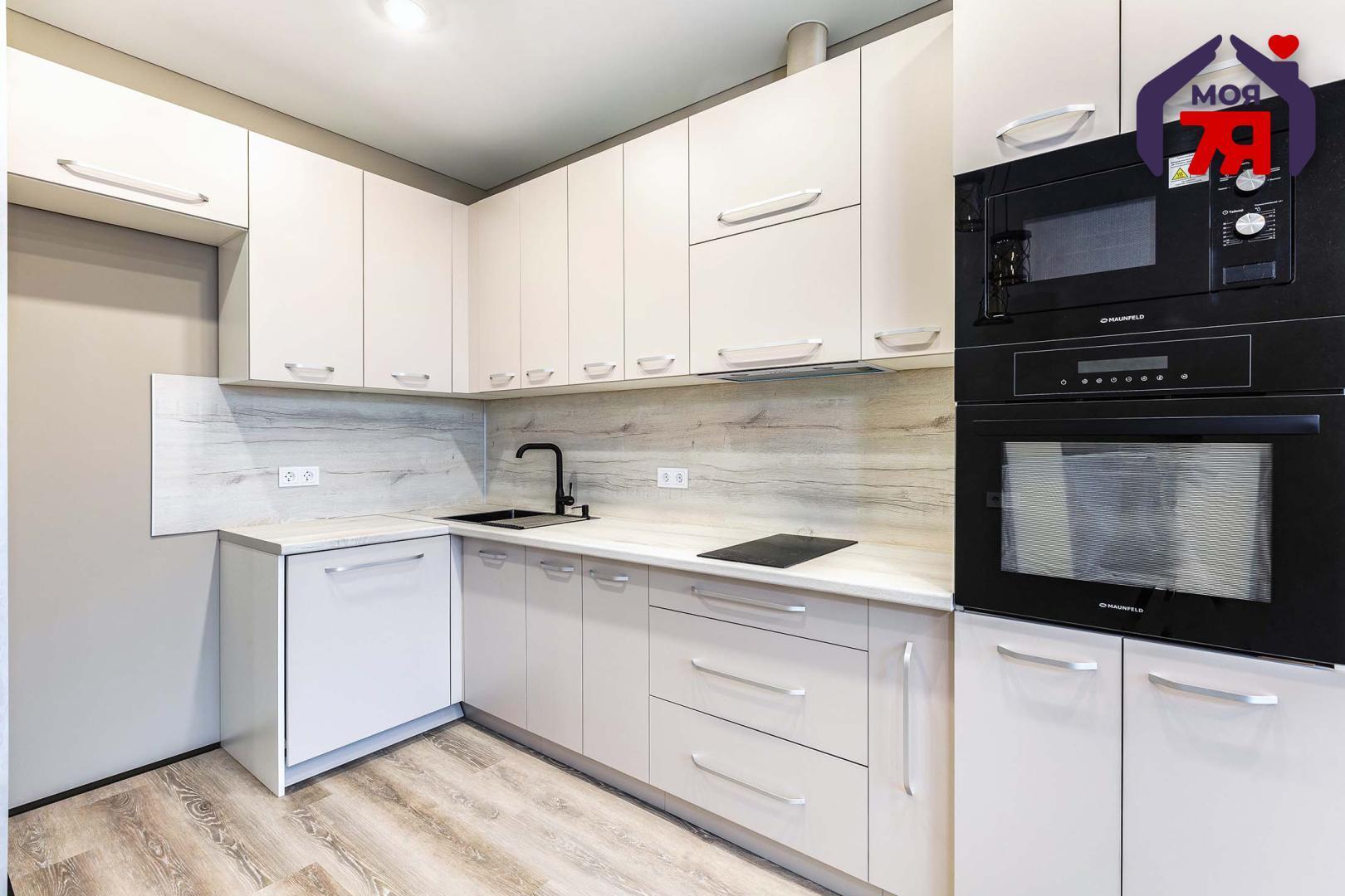 - Кухня светлая и функциональная. Предусмотрено много мест для хранения, установлена встроенная техника: посудомоечная машина, микроволновая печь и духовой шкаф. Удобная рабочая поверхность и окно, которое наполняет пространство естественным светом, делают кухню максимально комфортной.