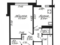 Общая площадь — 36,8 м², жилая — 17,4 м², кухня — 8,9 м².