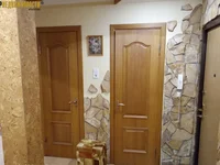 В свое время в ней был сделан качественный ремонт с использованием в отделке элементов декоративной штукатурки и пробки. Двери - массив, включая откатные в гостиную и санузлы, окна ПВХ на обе стороны, современная светлая плитка в санузлах, полы ламинат, в кухне на полу также плитка. Кухня квадратная площадью 8.5 м2 со встроенным гарнитуром. Просторная прихожая, металлическая дверь, лоджия выходит в тихий двор, она застеклена. Санузлы раздельные, счетчики воды, домофон.