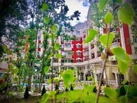 Яркое отличие нового комплекса – его территория, украшенная живыми цветами в виде реки, а также бассейн, выполненный в необычной форме, что подчеркивает экслюзивность. Еще одной особенностью нового проекта является парк. Обустроенная парковая территория площадью 9 гектар, граничащая с комплексом и близость Черного моря создают свой уникальный климат, способствующий общему укреплению здоровья и качеству Вашего отдыха.