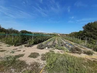 Площадь участка: 3703 кв.м., находится в местности „Карфилаки“. На участе растут несколько видов деревьев: персики, яблоки, груши, сливы, абрикосы, инжир; так же кустарники: малина, клубника, ежевика, черника и др.