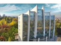 Здание воплотило в себе новейшие достижения мировой техники. Его гиперболоидная дугообразная форма достигается за счет вентилируемого фасада из натурального камня и ажурной системы «двойной оболочки» (двойного остекления), способствующей более эффективной тепло- и звукоизоляции. Летом естественная вентиляция обеспечивается постоянно циркулирующим потоком воздуха при открытых верхних и нижних вентиляционных решетках, а зимой они закрыты, образуя промежуточное изолирующее пространство.