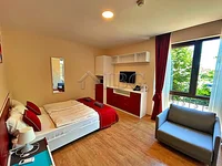 Планировка: Входной зал, просторная комната с кухней и спальной зоной, ванная комната с душем и туалетом, терраса с видом на зеленые зоны.
