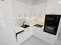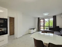 The apartment has an area of 118.5 m² and is located on the third floor. It consists of: an entrance hall, a large living room with a kitchenette and dining area, two bedrooms, two bathrooms with a bathtub and shower, and a terrace with a magnificent view of the greenery of the complex. The apartment is fully furnished with brand new furniture and appliances, and underfloor heating is installed in all rooms!
