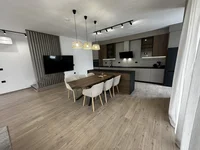 The house is furnished with custom-designed furniture. Yard: landscaped 700 m², separate summer veranda of 70 m², autonomous irrigation hydrophore system, and a 20 m³ well for collecting rainwater from the roof and all siphons, automatic lawn mower, yard lighting, and high-quality granite pathways around the house, parking for two cars.