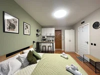 This cozy studio apartment offers 34 sq.m. of fully renovated living space. Every detail has been thoughtfully designed: the interior is decorated in pleasant green tones, with smart zoning — the kitchen area is visually separated from the sleeping area by a breakfast bar. The apartment features quality furniture and a fully equipped bathroom. A private, cozy terrace, hidden by lush greenery, is perfect for morning coffee or enjoying the fresh air.