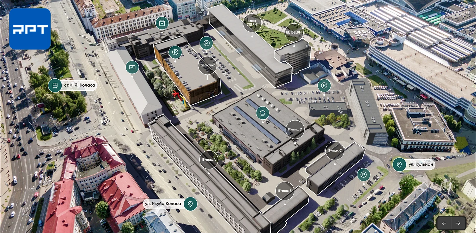 Обладатель премии Belarus Retail & Real Estate Awards 2025 как самый технологичный сайт. Семь зданий в одном комплексе — гастромолл, казино, бизнес-центр, паркинги. Вся инфраструктура собрана в едином интерактивном пространстве.