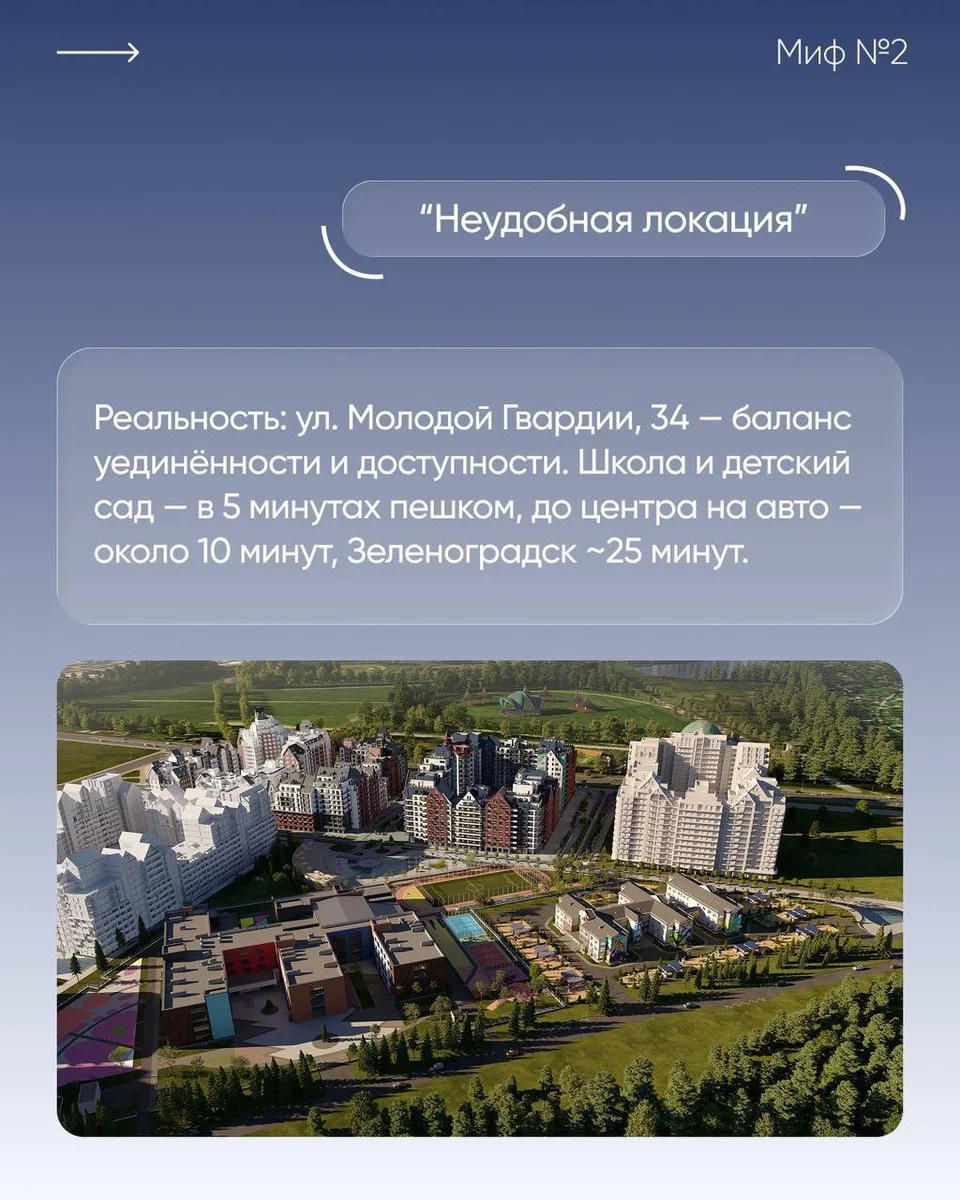 Реальность: Комплекс расположен на ул. Молодой Гвардии, 34 — это сбалансированное сочетание уединённости и доступности. В 5 минутах пешком — школа №58, детский сад и детская поликлиника. До центра на машине — около 10 минут, до моря 25-30 минут.