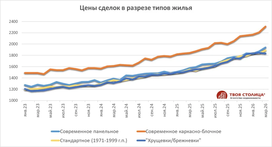 В марте средняя стоимость квадратного метра увеличилась примерно на 2 процента. Основной рост пришелся на современные каркасно-блочные дома и стандартные панельные квартиры 1977–1999 годов постройки. В то же время в сегменте хрущевок и брежневок отмечено снижение цен. Как правило, дешевеют квартиры без ремонта, расположенные в спальных районах с менее развитой транспортной инфраструктурой.