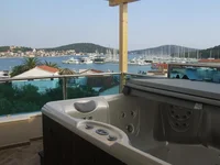 Терраса оборудована большим джакузи на 6 человек и шезлонгами для принятия солнечных ванн и наслаждения. На нижнем этаже находится ванная комната и гостиная с выходом на крытую террасу с видом на море.