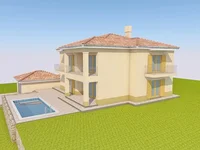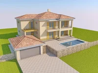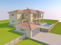 Project documentation has been prepared and a building permit has been issued for a family house with a total living area of 295 m² including a swimming pool. The plot currently contains an existing structure intended for demolition, consisting of two residential units. The ground floor includes an entrance hall, storage room, two spacious bedrooms each with its own bathroom, an additional toilet, a kitchen with living room, and a covered terrace. The first floor comprises an entrance hall, storage room, two bedrooms also with private bathrooms, an additional toilet, a kitchen with living room, a balcony, a covered terrace, and a utility room.