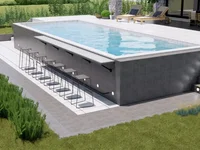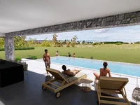 Бассейн 8х4 метра (32 кв.м.). Большая крытая терраса и зоны для принятия солнечных ванн расположены вокруг бассейна.