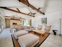 Через высокие стеклянные стены высотой 2,40 метра и раздвижные двери шириной 6 метров это пространство открывает беспрепятственный вид на зеленый сад и уютный бассейн, создавая для зрителя захватывающий опыт.