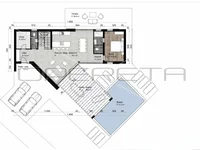 At the end of a peaceful Istrian village, harmoniously located among only a few houses, this incredible villa is being built, which exudes a unique design.With a total area of 229 m² spread over two levels, this house offers a spacious interior that will refresh your everyday life. The ground floor will include a guest toilet, a practical pantry and an open concept living room, kitchen and dining room. This space is connected to a covered terrace, a sun deck, a yard and a spacious pool of 38 m². Also, on the ground floor there is one bedroom with its own bathroom and exit to the yard.There are three additional bedrooms on the first floor of the house. Among them, the master bedroom stands out, which has its own private bathroom, while the other two rooms share a bathroom located in the hallway.The heating in this house will be provided by comfortable underfloor heating and modern air conditioners that, in addition to heating, also provide effective cooling for the warm summer months. Airiness and light will be emphasized thanks to the glass walls that will be installed throughout the villa.The planned completion of construction is in the fall of 2024