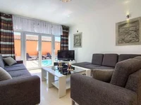 Из гостиной, столовой и кухни есть выход в красивый сад с бассейном площадью 32 м2, в котором царит приятная и уединенная атмосфера. Бассейн подогревается системой Solgar. Вилла также предлагает джакузи и настольный теннис. Вилла полностью меблирована и выставлена на продажу.