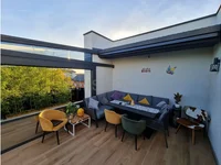 В указанном помещении постелен высококачественный паркет, а стеклянные стены и крыша подключены к электричеству. моторные, а при необходимости их можно легко убрать и создать открытое пространство (террасу).