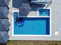 Обширный сад выделяется большим бассейном с зоной для загара и джакузи, а также вспомогательным зданием площадью 40 м². Часть здания предназначена для социальных игр, в то время как остальная часть служит для хранения. Уличный камин создает уютную атмосферу. Огражденный двор включает парковку для шести автомобилей, ворота с дистанционным управлением и видеосигнализацию для безопасности.
