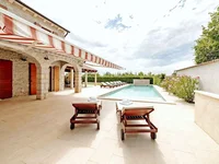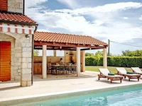 Внешняя территория полностью огорожена и озеленена средиземноморскими растениями и зеленью, создавая приватную и расслабляющую обстановку. В саду есть крытая летняя кухня, идеальная для обедов и развлечений на свежем воздухе, а также бассейн с зоной для загара, что значительно увеличивает стоимость недвижимости и ее привлекательность для туристического рынка аренды в Истрии.