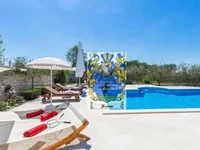 Дом с бассейном расположен в просторном саду 990 м2. Дом расположен на двух этажах, общей площадью 181 м2 и состоит из первого и первого этажей. На первом этаже есть прихожая, гостиная, кухня с обеденной зоной, гостевой туалет и одна спальня с ванной комнатой. На втором этаже находятся две спальни с отдельной ванной комнатой, одна комната выходит на балкон с видом на море и окружающую зелень. Дом полностью оборудован кондиционером, установлена первая фаза центрального отопления, имеет просторный бассейн с подогревом 45 м2 с солярием и летнюю кухню с крытой террасой и парковкой с четырьмя парковочными местами. Агентство рекомендует очень тихое место на краю деревня.