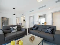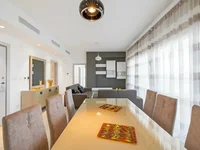 Современный пентхаус является частью хорошо продуманного проекта, состоящего из четырех этажей и шести квартир от двух до трех спален. Когда вы войдете внутрь, вас встретит просторная открытая планировка, плавно соединяющая кухню, столовую и жилые помещения, все с роскошной отделкой. Кухня может похвастаться современными приспособлениями и достаточным пространством для хранения.